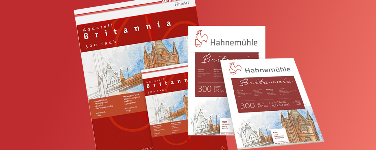 Hahnemühle BritanniaThis great value paper takes a wide variety of media extremely well, from watercolour and gouache, to inks, acrylic colours, and even for printmaking. It is a natural white, sturdy paper, with good wet strength. Like all Hahnemühle papers, Britannia is acid-free and age resistant. The packs come with 10 sheets of 300gsm matte (cold press) paper in A6, A5, A4, A3 & A2 sizes. |