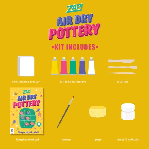 • Kit includes 500 g (1.1 lbs) air dry pottery clay, 5 paint colours, paint brush, 3 clay making tools, sponge, 20 ml of PVA glaze and a 32-page book.